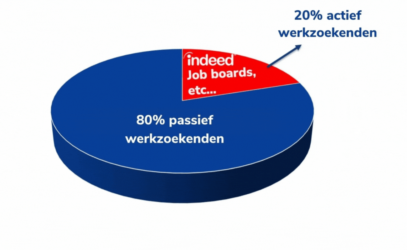 Veel werkgevers plaatsen vacatures op Indeed en andere job boards. Slechts 20% van de arbeidsmarkt is hier te vinden. Het gevolg is dat er teveel concurrentie is en dat er te weinig passende kandidaten zijn.